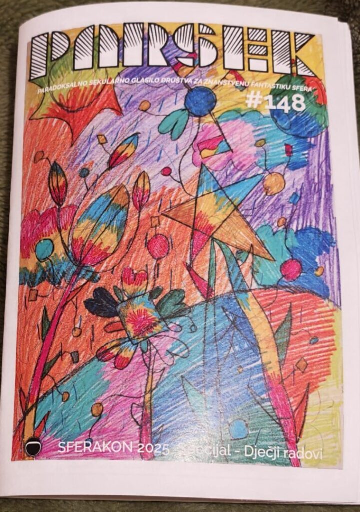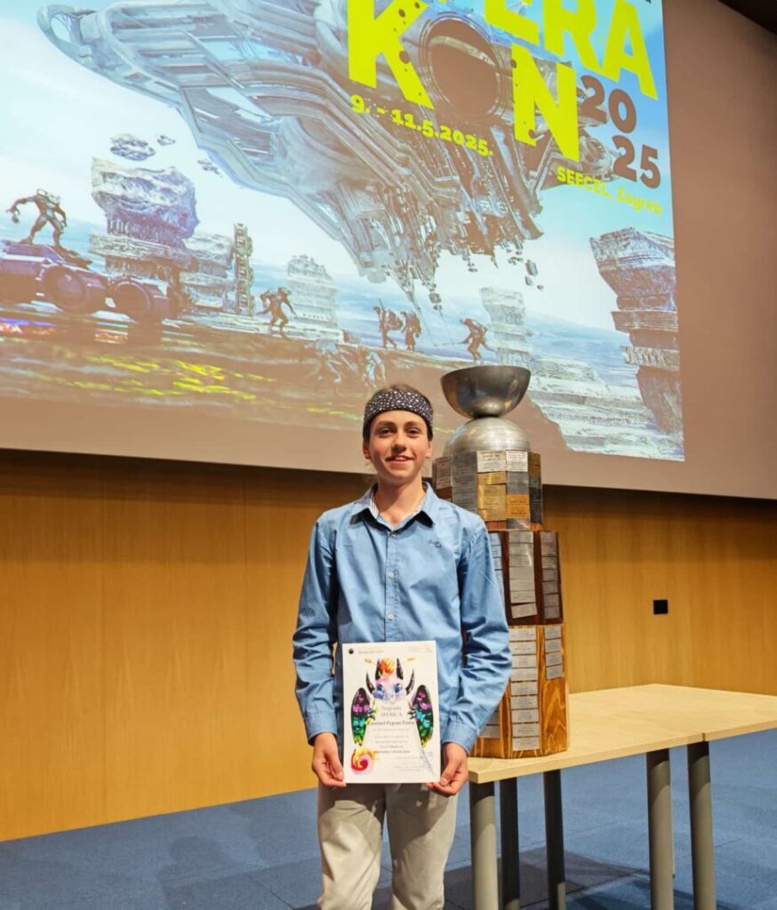 U subotu, 10. svibnja 2025., sam bila na SFeraKonu gdje sam dobila nagradu, jer sam osvojila prvo mjesto na likovnom natječaju SFerice. Naslikala sam rad na temu Dvorac koji luta svijetom.